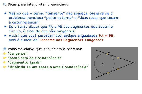 O Teorema dos Segmentos Tangentes é muito útil quando o problema envolve comprimentos iguais saindo de um mesmo ponto externo.