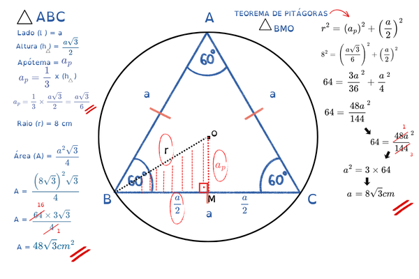 Circunferência CIRCUNSCRITA ao triângulo equilátero, encontre o lado (a) e área (A)