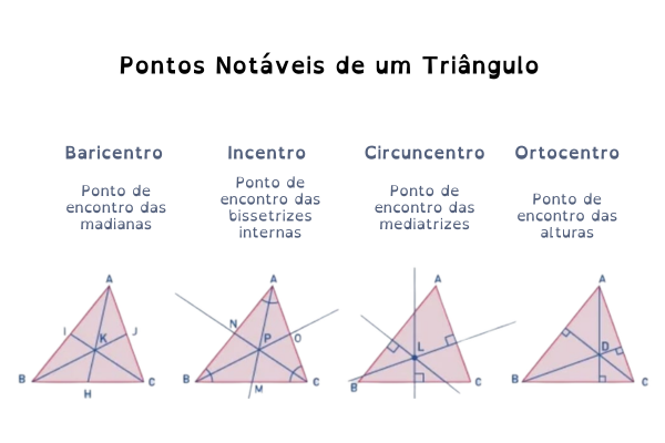 - Circuncentro (L) – é o ponto de encontro das mediatrizes (retas perpendiculares nos pontos médios) dos lados de um triângulo, sendo o centro da circunferência que circunscreve o polígono e equidistante dos seus três vértices.