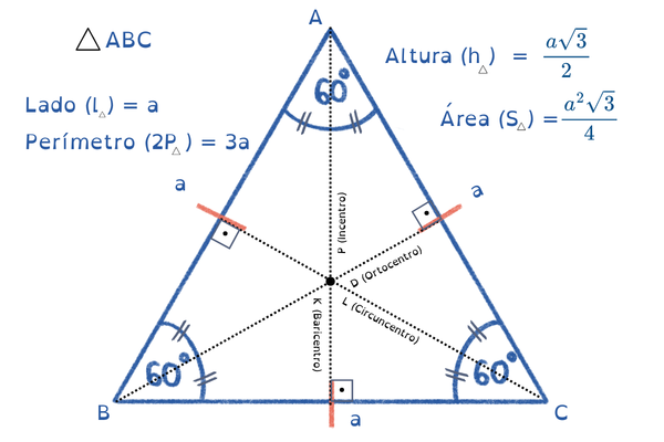 - O ponto de encontro da mediana, altura, bissetriz e mediatriz, coincidem no mesmo ponto.