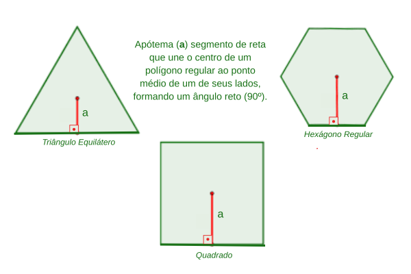 A apótema é o segmento que liga o centro de um polígono regular até o ponto médio de um de seus lados, formando um ângulo de 90°.